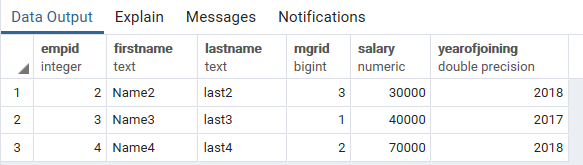 SELECT EmpID, FirstName, LastName, MgrID, Salary,YearOfJoining